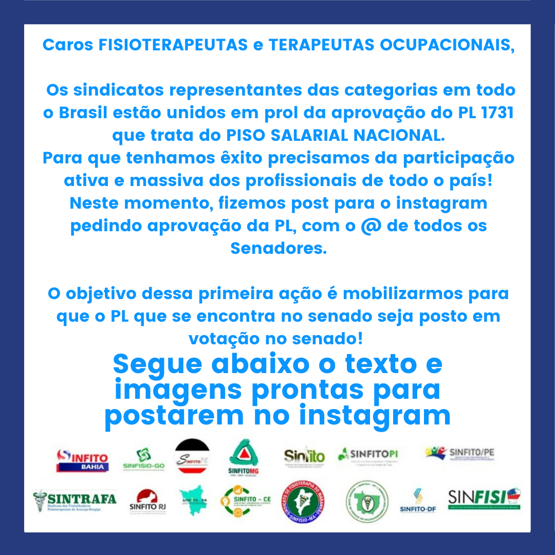 Prezados senadores, a FISIOTERAPIA e a TERAPIA OCUPACIONAL são duas importantes profissões da Saúde que precisam ter a aprovação de seu piso salarial para valorização necessária diante de suas atribuições.